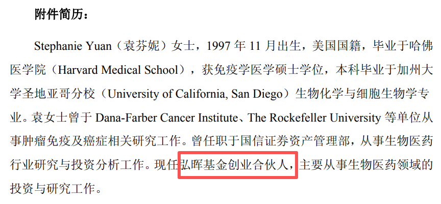 公告里还藏着一条更重要的信息:袁芬妮现任弘晖基金创业合伙人。