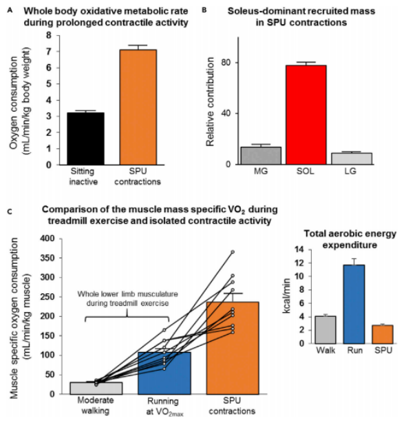 更让人惊讶的是,虽然全身的能量消耗增加不多(约1.3−2.0 METs),但比目鱼肌的局部代谢率却高得惊人!研究者通过MRI精确测量了每位受试者比目鱼肌的质量(平均双侧总和约1.07 kg),再结合全身耗氧量计算出:在SPU过程中,比目鱼肌的局部耗氧量达到了237 mL/min/kg肌肉。作为对比,正常走路时整条下肢肌肉的平均耗氧量仅为30 mL/min/kg,这意味着,仅占体重1%的比目鱼肌,在坐着做SPU时的代谢强度,竟然是走路时整条腿肌肉平均水平的近8倍!局部高代谢,却不让全身“大动干戈”,这正是SPU运动的精妙之处。