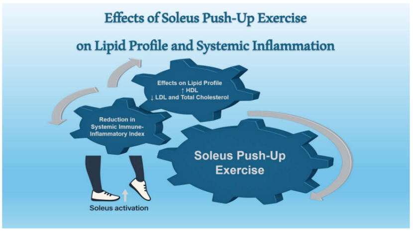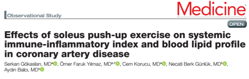 [2] Gökaslan S, Yilmaz ÖF, Korucu C, Günlük NB, Balci A. Effects of soleus push-up exercise on systemic immune-inflammatory index and blood lipid profile in coronary artery disease. Medicine (Baltimore). 2025 Aug 1;104(31):e43643. doi: 10.1097/MD.0000000000043643. PMID: 40760610; PMCID: PMC12323936.