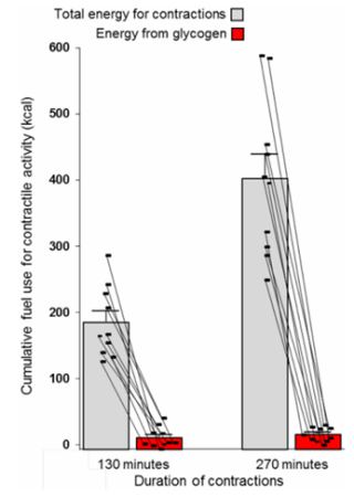 图:在腓肠肌进行SPU收缩的长时间局部活动期间,腓肠肌糖原对收缩总能量(即活动能量消耗)的贡献微乎其微