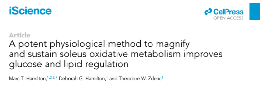 [1] Hamilton MT, Hamilton DG, Zderic TW. A potent physiological method to magnify and sustain soleus oxidative metabolism improves glucose and lipid regulation. iScience. 2022 Aug 5;25(9):104869. doi: 10.1016/j.isci.2022.104869. PMID: 36034224; PMCID: PMC9404652.