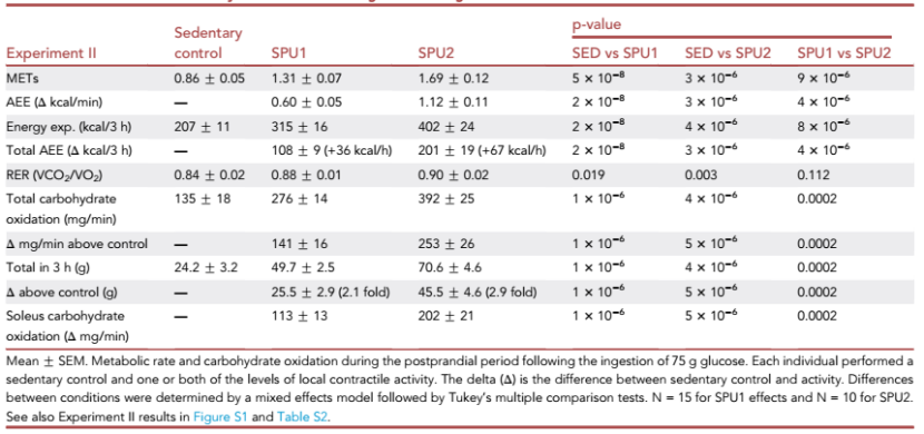 最后,研究者还追踪了全身的燃料使用情况。在安静状态下,全身肌肉仅贡献约15%的餐后葡萄糖氧化,比目鱼肌更是微乎其微。然而,当SPU启动后,情况彻底反转。下表的数据显示:在SPU1(较低强度)时,3小时内的全身碳水化合物氧化量从24克增加到50克;而在SPU2(较高强度)时,这一数字进一步攀升到71克,已经超过了喝下去的75克葡萄糖!经过计算,其中约80%的额外碳水化合物氧化来自比目鱼肌。也就是说,这1%体重的肌肉,硬生生把自己变成了餐后燃糖的“主角”,其代谢贡献甚至超过了全身所有其他组织之和。