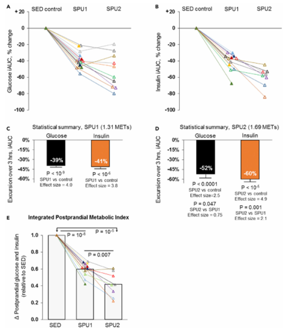 答案是肯定的。在口服75克葡萄糖后的3小时内,与“坐着不动”的对照组相比,进行SPU2(较高强度)的志愿者血糖浓度平均降低了50 mg/dL,降幅高达52%(下图A)。更关键的是,胰岛素的曲线下面积(iAUC)减少了60%(下图D),同时C肽水平也显著下降。这说明,胰腺不再需要像“拼命三郎”般地分泌大量胰岛素来应付高血糖。换言之,SPU让身体对胰岛素的需求大幅降低,这对保护胰岛功能、预防2型糖尿病具有重要意义。