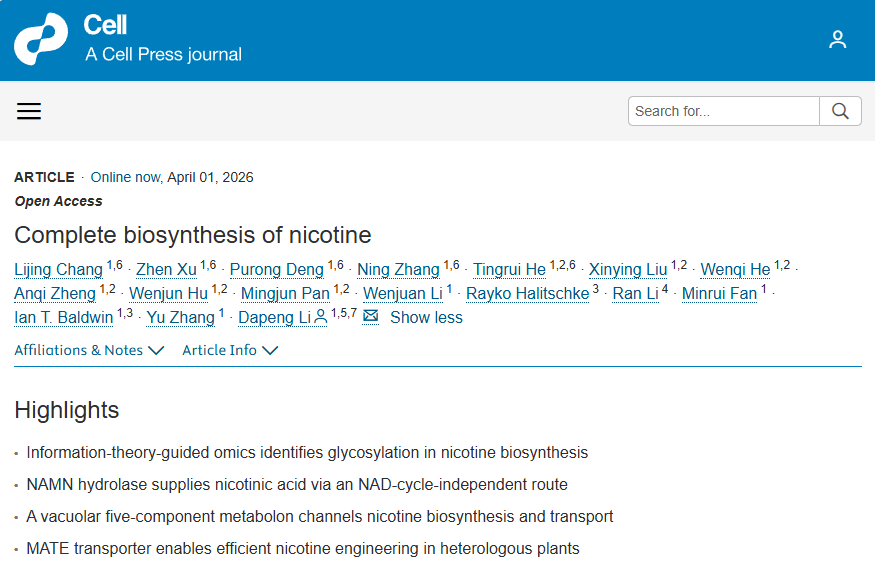 Cell重磅发布!中国科学院李大鹏团队首次完整解析尼古丁生物合成通路,破解七十年科学谜题
