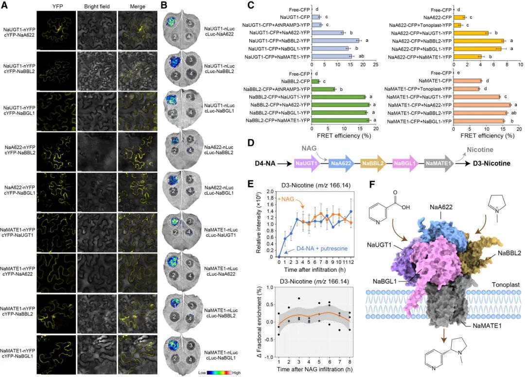 令人惊叹的是,研究团队发现催化上述步骤的五个关键蛋白(NaUGT1, NaA622, NaBBL2, NaBGL1 和转运蛋白NaMATE1)并非独立工作,而是在烟草根细胞的液泡膜上动态组装成一个多酶“代谢区室”。