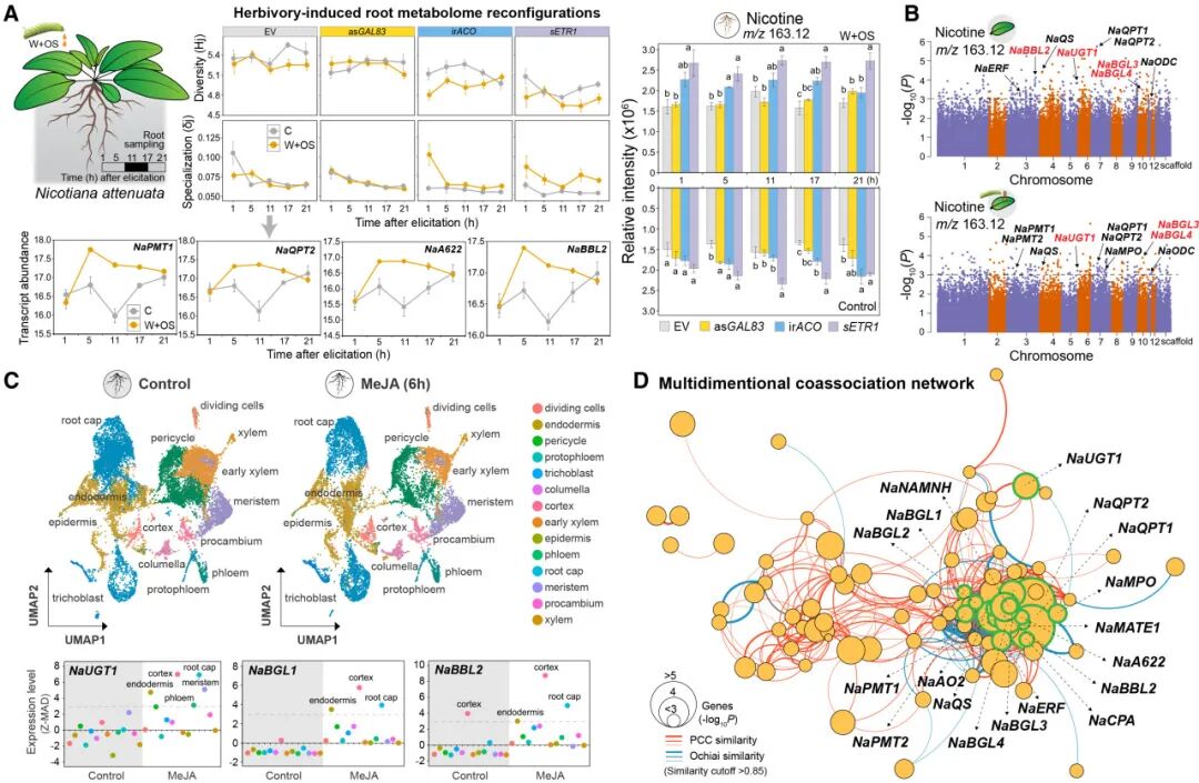 该研究团队通过信息理论指导的多组学分析,包括代谢组、转录组、单细胞测序和代谢数量性状位点分析,意外发现糖基化相关基因与已知的尼古丁合成基因高度协同表达。深入探究后,他们揭示了隐藏的糖基化步骤是耦合反应得以顺利进行的核心“钥匙”。