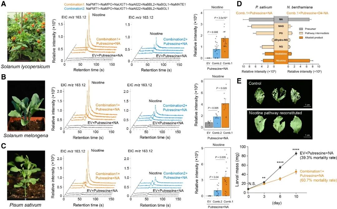 为验证该通路的完整性与应用潜力,研究团队成功在非烟草植物(如番茄、茄子和豌豆)的叶片中,通过导入包括NaMATE1转运蛋白在内的全套合成基因,实现了尼古丁的从头合成。结果显示,包含NaMATE1的完整代谢区室重建,能显著提高异源植物中的尼古丁产量。