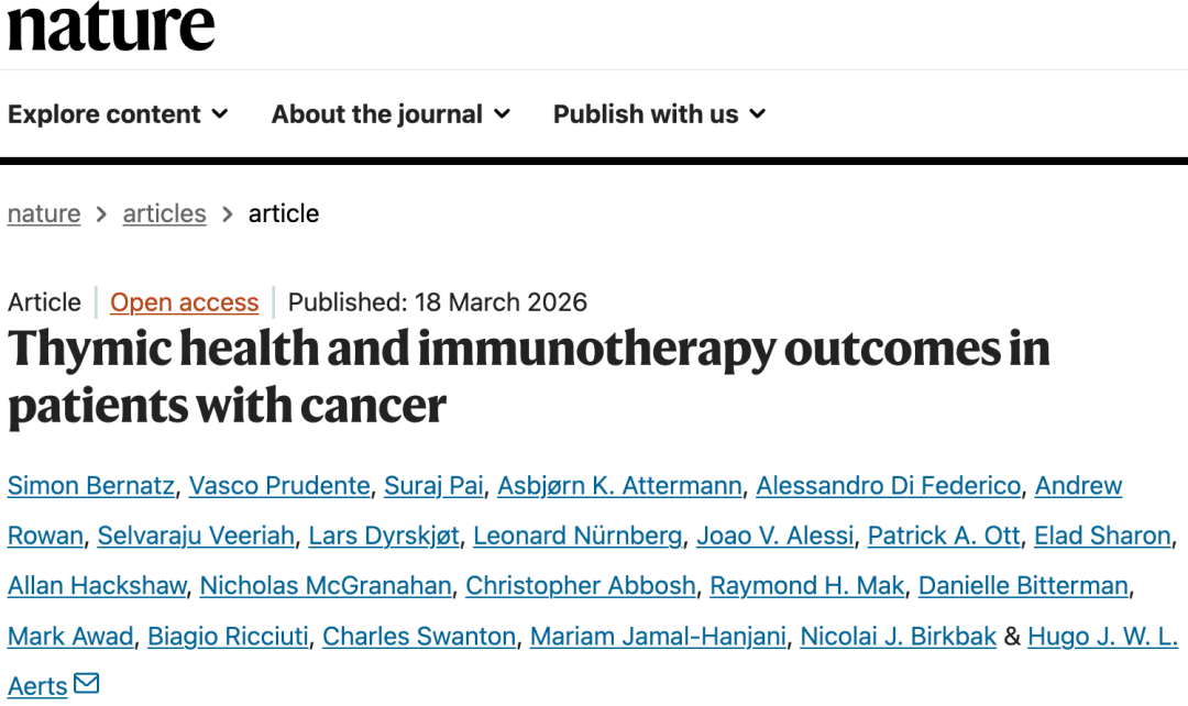 [4].Bernatz, S., Prudente, V., Pai, S. et al. Thymic health and immunotherapy outcomes in patients with cancer. Nature (2026).
