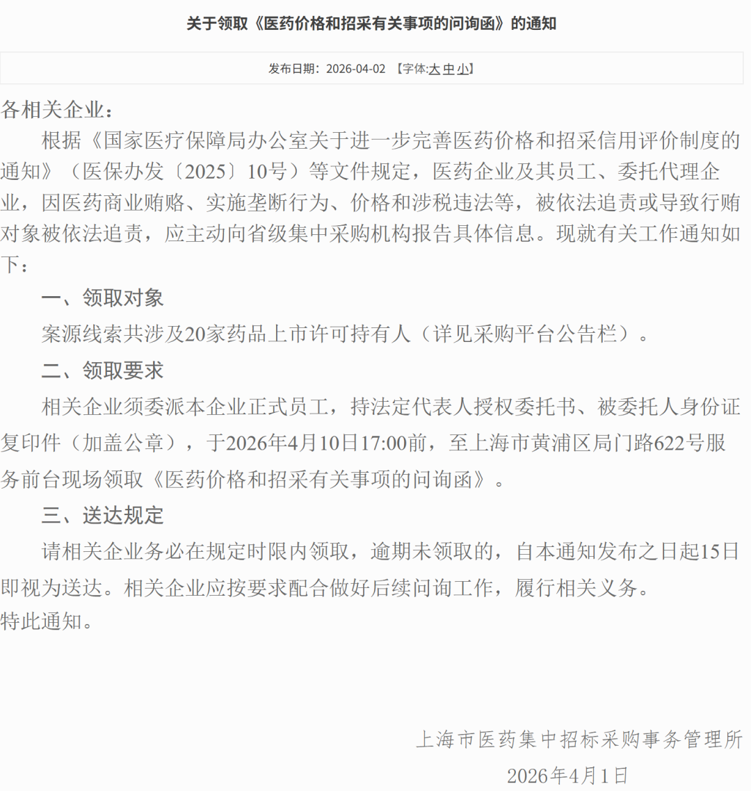 今日(4 月 2 日),上海药事所发布“关于领取《医药价格和招采有关事项的问询函》的通知”,20 家药企因医药商业贿赂等原因被发了问询函。
