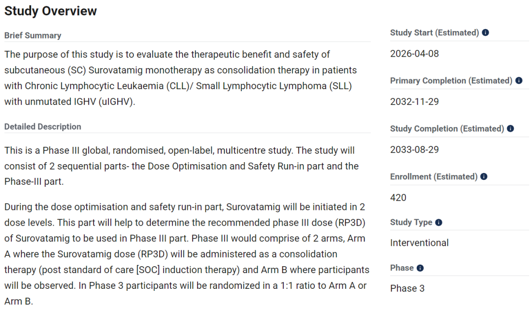 该三期临床计划入组420例CLL/SLL患者,预计2032年初步完成。