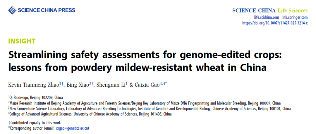 近日,Science China Life Sciences(《中国科学:生命科学》英文版)Insight栏目发表中国科学院遗传与发育生物学研究所高彩霞研究员题为 “Streamlining safety assessments for genome-edited crops: lessons from powdery mildew-resistant wheat in China”的评论文章,系统介绍了我国率先批准基因编辑抗病小麦的安全评价的要求及过程。文章全面解析了多重基因编辑在复杂多倍体作物中的应用突破,以及科学、简化、以产品为基础的安全评价体系如何加速前沿育种技术走向产业应用。