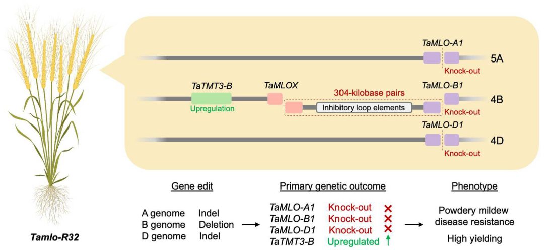白粉病是威胁小麦生产的主要真菌病害,严重时可导致减产40%。传统抗病育种耗时长、易拖累产量;化学杀菌剂成本高、污染环境且易诱发抗药性。高彩霞研究团队利用CRISPR-Cas9核糖核蛋白(RNP)编辑技术,精准敲除小麦中3个白粉病感病基因TaMLO,并通过特定位点缺失实现上游产量相关基因TaTMT3-B的上调,最终获得广谱高抗白粉病、且产量不降低的小麦新种质(TaMLO-R32基因型)。