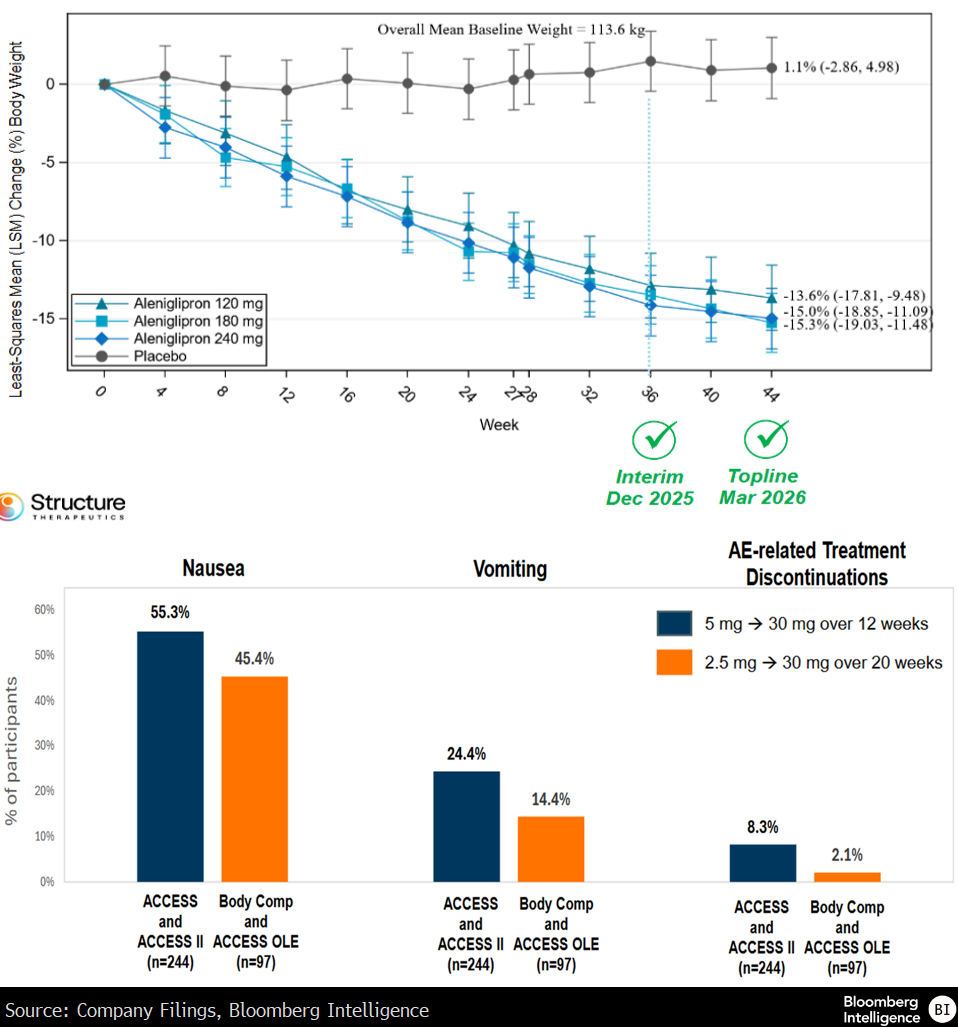 Structure的aleniglipron在ACCESS II(44周)及ACCESS开放标签扩展(OLE)研究(56周)中显示,绝对减重幅度最高达15%-16%,且截至试验期末,减重曲线未出现平台期。整体疗效与诺和诺德的Wegovy口服剂型相当,并优于礼来的orforglipron;后两者虽在三期试验中测试时间更长,但受试患者基线体重更轻。ACCESS II研究中,180mg与240mg aleniglipron剂量组的体重下降幅度相近,其中180mg组的耐受性与120mg相当,而240mg组观察到更高比例的呕吐和恶心症状。