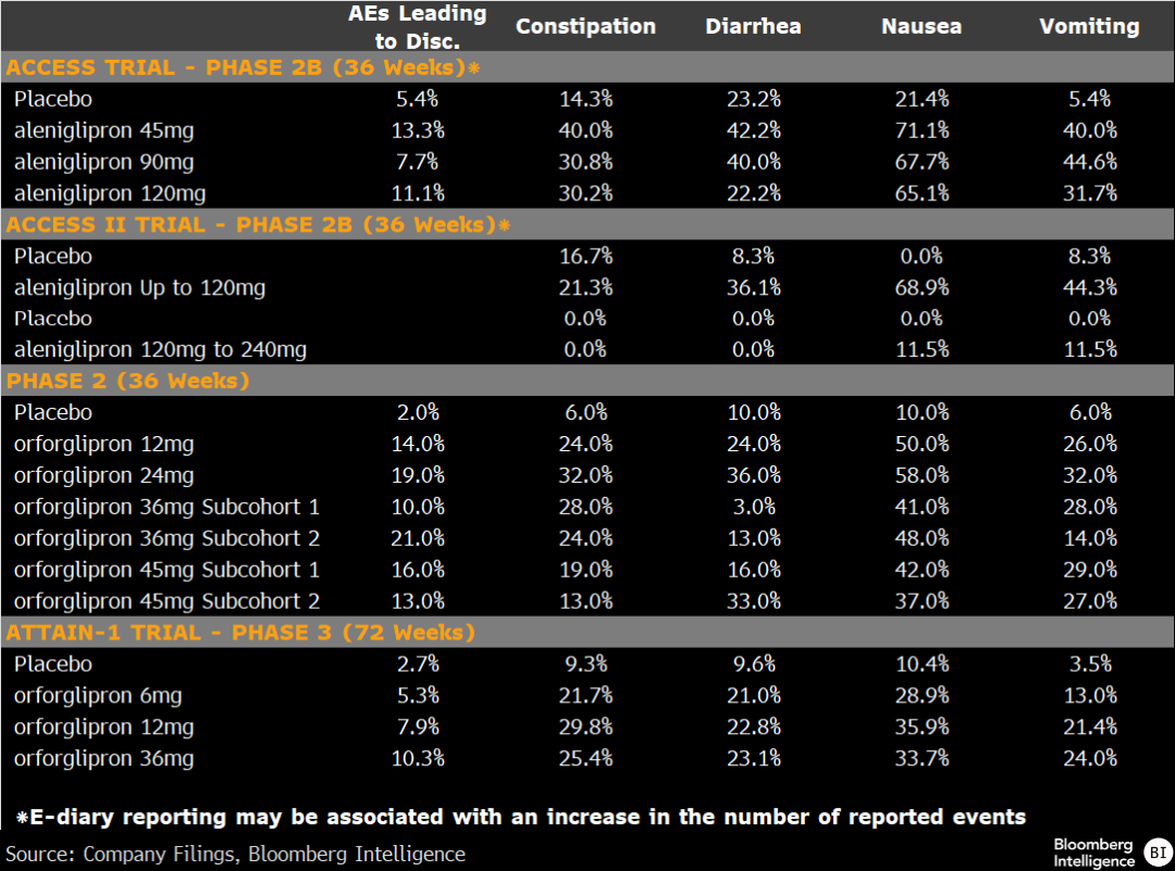 Aleniglipron的疗效表现令人印象深刻,但早期数据在安全性方面的说服力相对不足,尽管尚未观察到肝毒性。ACCESS项目中的患者停药率处于同类药物区间内,且主要集中在前12周;不过,与orforglipron相比,其胃肠道副作用发生率偏高,尤其是呕吐和恶心,其中恶心在整个ACCESS试验中(120mg剂量下)均有发生。Structure在试验中采用电子日记记录症状,这种方式可能高估发生率,幅度最高可达一倍。三期试验将采用更低的起始剂量2.5mg(此前为5mg),这一调整有望改善耐受性;这一点已在OLE及身体成分研究的初步数据中得到体现,其中服用aleniglipron患者的停药率仅为2%,而ACCESS与ACCESS II研究合计的停药率为8%。
