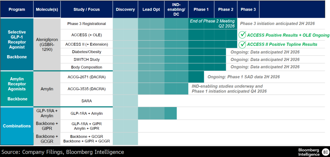 Structure预计将在二季度与美国食品药品监督管理局举行二期试验结题会议,这将为aleniglipron于下半年启动三期试验铺路。后期试验的最高剂量尚不明确。这款小分子口服GLP-1药物预计最早在2028年才有望上市,届时将与诺和诺德的Wegovy口服剂型(多肽)以及礼来的orforglipron(小分子)展开竞争。ACCESS研究开放标签扩展研究的初步结果显示,aleniglipron可能具备同类最佳的疗效,同时也突显了较低2.5mg起始剂量在耐受性方面的优势。身体成分数据预计于下半年公布。根据ATTAIN-1三期试验数据,orforglipron减重效果中约27%来自瘦肌肉流失。