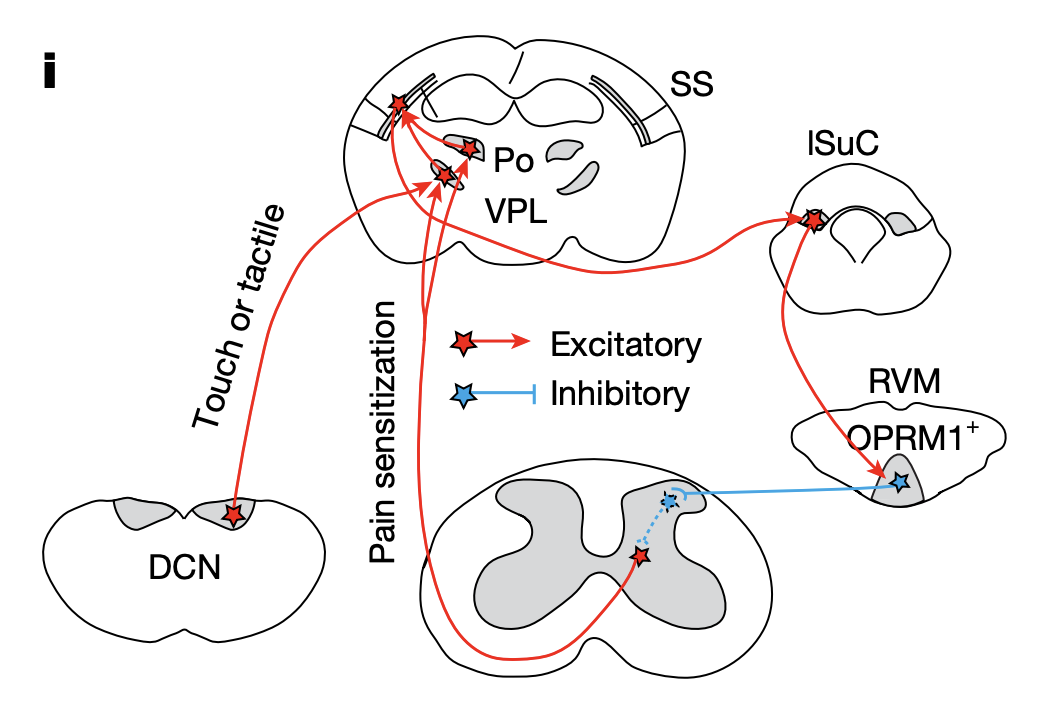 2026 年 4 月 1 日,斯坦福大学陈晓科副教授团队(王倩等人为论文第一作者),在 Nature 期刊发表了题为:Deconstruction of a spino-brain–spinal cord circuit that drives chronic pain 的研究论文。该研究揭示了一条特异性驱动慢性疼痛的脊髓-脑-脊髓环路,抑制该环路可缓解慢性疼痛,同时保留急性疼痛反应(即我们的身体对急性损伤或疾病发出警示信号的能力)。这一发现不仅挑战了长期以来关于中枢神经系统(CNS)如何处理疼痛的假说,还为开发能够缓解持续性疼痛而不削弱身体重要预警机制的靶向疗法开辟了新途径。论文通讯作者陈晓科表示,这项研究表明,急性疼痛和慢性疼痛可以完全分开。存在一个专门负责慢性疼痛的神经环路,只有在受伤后才会激活,这使我们有机会针对性治疗慢性疼痛,同时保留保护性的急性疼痛反应。组织炎症或神经损伤通常会导致暂时性的异常疼痛和痛觉过敏,这种反应能促使机体关注受损区域,以避免进一步伤害并促进愈合。然而有时这种敏化现象会持续存在,进而发展为慢性疼痛,造成巨大的心理和社会经济负担。虽然组织损伤常发生在外周,但越来越多证据表明,大脑中枢的内源性疼痛调控网络在慢性疼痛状态的启动和维持中发挥着关键作用。该网络中分布的脑区信息最终汇聚到中脑导水管周围灰质(Periaqueductal Gray,PAG)-延髓头端腹内侧区(Rostral Ventromedial Medulla,RVM)系统,随后通过位于延髓头端腹内侧区(RVM)的脊髓投射神经元(RVMSC 神经元)与脊髓局部疼痛环路产生交互作用。但目前关于外周损伤信息如何传递至这些下行 RVMSC 神经元的机制,目前仍知之甚少。目前,学术界已形成了一个被广泛接受的工作模型:OPRM1+ RVMSC 神经元活动会促进疼痛,并可能推动慢性疼痛的发展。然而,在行为动物中选择性激活 OPRM1+ RVMSC 神经元的工作尚未开展,因此,该模型尚未得到直接验证。此外,若该模型成立,PAG 输入如何调控这些神经元活动便成为谜题——因为 PAG 激活的净效应是抑制疼痛而非促进疼痛。在这项最新研究中,研究团队通过开发遗传学和病毒工具,对 OPRM1+ RVMSC 神经元进行调控,结果发现,该神经元在损伤后的疼痛敏化中具有特异性作用,但不参与急性疼痛过程。以 OPRM1+ RVMSC 神经元为起点,结合单突触逆行示踪与通路操控技术,研究团队绘制出多突触神经环路图谱:该回路从脊髓出发,经脊髓丘脑束传递至初级躯体感觉皮层,随后通过外侧上丘(ISuC,而非经过 PAG)从皮层返回至 OPRM1+ RVMSC 神经元再投射至脊髓。该环路特异性参与损伤诱导的机械性痛觉过敏,而在健康状态下对急性伤害性疼痛作用有限。具体来说,在健康小鼠中,沉默该环路中任一节点对疼痛感知影响微弱,但在炎症性和神经病理性疼痛模型中,却能消除机械性痛觉过敏并恢复正常的疼痛反应阈值。在健康小鼠中,对该环路各节点进行重复性(而非急性)激活,足以诱发强烈的慢性机械性痛觉过敏。此外,无论抑制还是激活该环路,都不影响小鼠对强烈危险刺激的正常回避反应,这意味着急性疼痛通路完好无损,而机体的基本防御功能不会被干预。总的来说,这些发现揭示了一个连接上行与下行通路的脊髓-脑-脊髓环路,该环路特异性驱动慢性机械性疼痛。这些发现也提示了我们,大脑中存在两套功能相反的疼痛调控网络:一个是经典的 PAG-RVM 通路,主要发挥抑制疼痛的作用;另一个是该研究中发现的脊髓-脑-脊髓环路,主要负责放大和维持慢性疼痛。两者协同作用,共同调控机体对疼痛的感知。这项研究为识别慢性疼痛治疗的细胞靶点提供了新方向,靶向该环路有望实现慢性疼痛治疗的同时保留保护性伤害性疼痛功能。