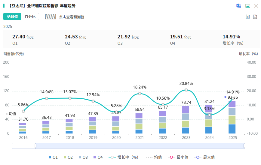 摩熵医药数据显示,芬太尼相关剂型的品种在2025年全终端医院市场的销售总额超93亿元,同比增长达14.91%,其中人福医药以90.23%的市场份额,领跑院内市场,进一步稳固了龙头地位。