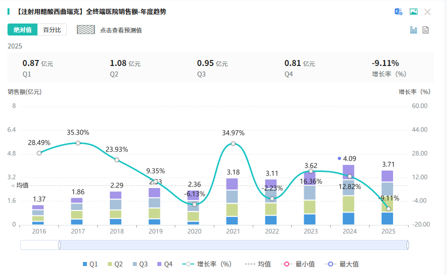 摩熵医药数据显示,注射用醋酸西曲瑞克在2025年全终端医院市场销售额达3.7亿元,是辅助生殖领域的重要品种。