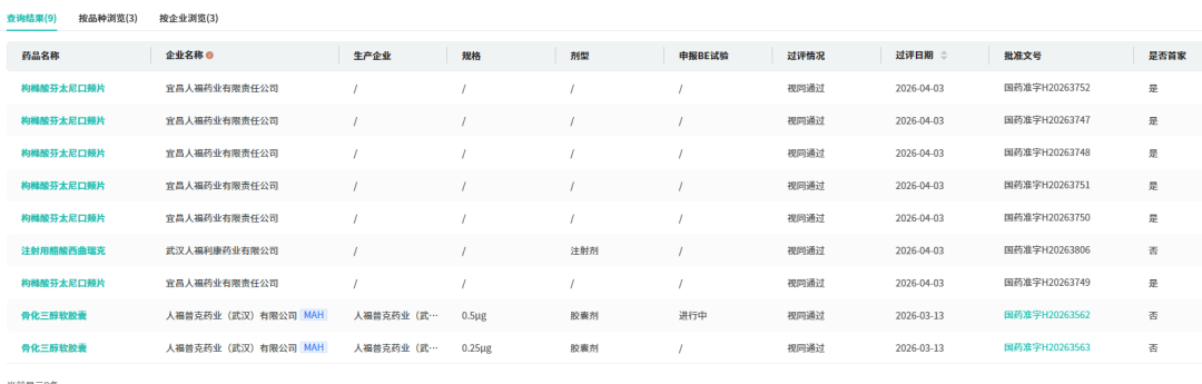 进入2026年,人福医药在仿制药与新药研发上均表现活跃。截至目前,今年已有枸橼酸芬太尼口颊片、骨化三醇软胶囊、注射用醋酸西曲瑞克3个品种获批生产并视同过评,均为重要治疗领域的产品布局。