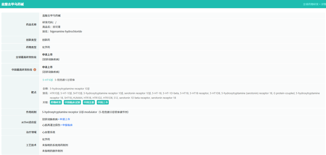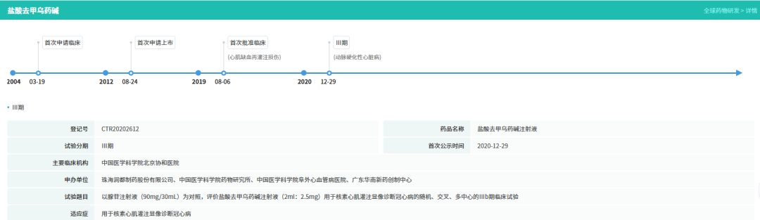 同日,珠海润都制药申报的1类创新药盐酸去甲乌药碱注射液也获得上市批准。该药为心脏负荷试验药物,适用于核素心肌灌注显像(MPI),辅助评估心肌缺血。