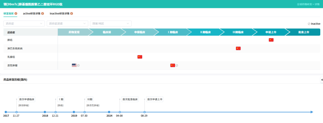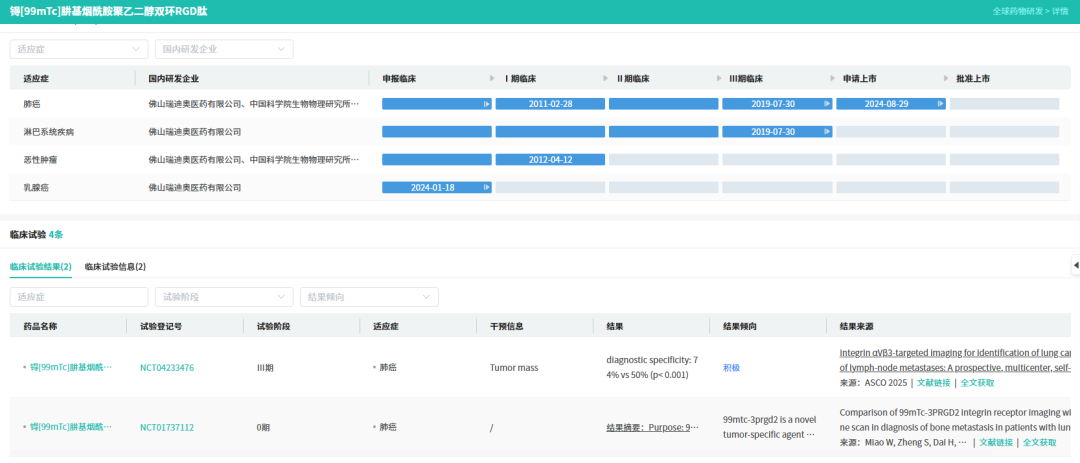 4月2日,国家药监局(NMPA)官网显示,瑞迪奥开发的1类放射性诊断新药锝[99mTc]佩昔瑞特加肽注射液及制备该药品的注射用锝[99mTc]佩昔瑞特加肽药盒通过优先审评程序获批上市,用于可疑肺癌患者区域淋巴结转移的辅助诊断。该药是国内首个在该靶点获批的核医学诊断1类新药,也是全球首个用于SPECT显像的广谱肿瘤显像剂。