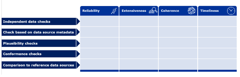 第二类为基于数据源元数据的检查。该类量度依赖于对特定数据集的深度认知,如元数据或支持性文件中提供的信息。例如,数据集可附带描述数据点置信水平的元数据(如通过算法将数值映射至标准编码时的置信度),可用于评估数据集的可靠性。