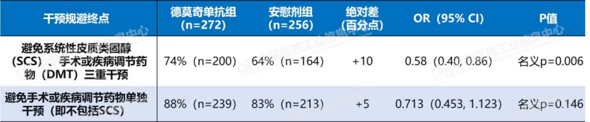 但获批逻辑成立的理由有二。其一,手术规避终点。德莫奇单抗组52周内未接受手术或疾病调节药物的比例为88%,安慰剂组83%(p=0.146)。尽管未达统计学显著性,但5个百分点的绝对差在真实世界中具有临床参考价值,尤其对于反复手术史且对再次干预抗拒的患者群体。其二,安全性相当,无新增风险信号。
