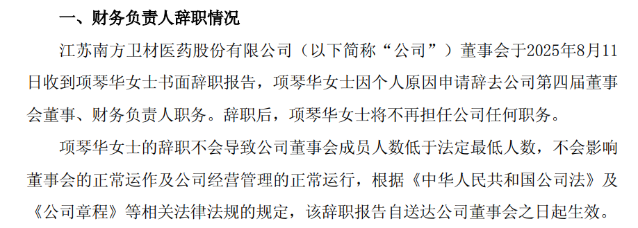南卫股份,这家做创可贴和医用胶带起家的常州上市公司,最近贡献了A股2026年开年最奇葩的一条高管辞职理由——公司董事兼财务负责人(CFO)许晓先生,因“个人职业发展规划调整及薪资不及预期”,申请辞去一切职务,不再担任公司任何职务。