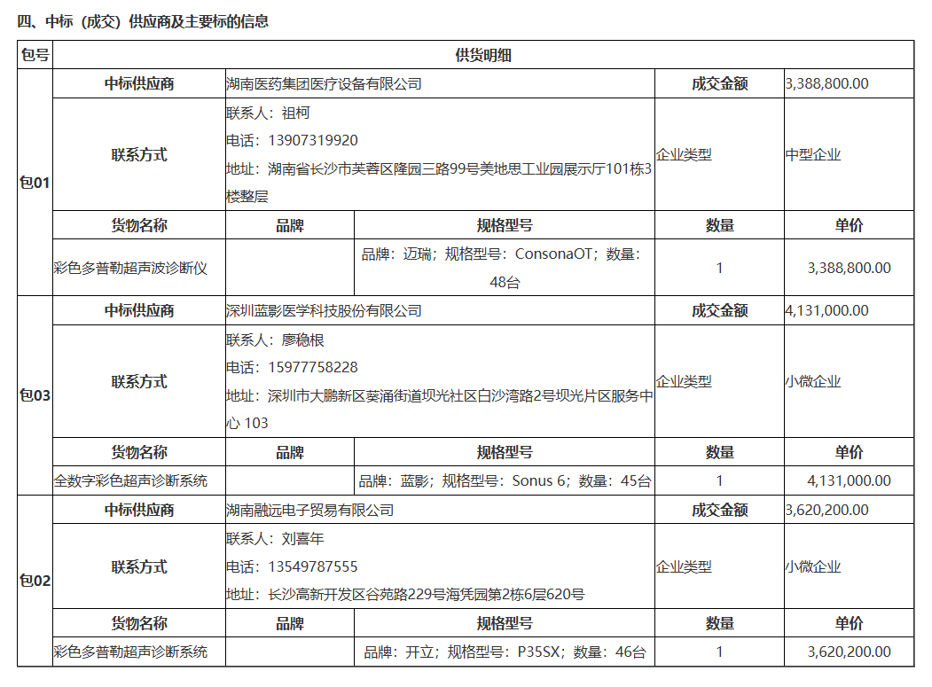 本次湖南县域医共体项目聚焦基层医疗设备更新需求,共计采购139台彩超设备,分3个包段推进实施,项目初始预算总价达7645万元。经过公开招标竞价,最终中标总价仅为1114万元,整体价格降幅高达85.43%,省下超6500万元财政资金。从采购定价来看,三包设备统一设定单台限价55万元,而最终中标单价仅在7.06万元至9.18万元之间,单台设备降幅均超过83%。远超常规医疗设备集采的降价幅度,彻底挤干了设备价格水分,实现了基层医疗采购成本的大幅压降。值得关注的是,本次采购严格落地品牌版“兼投不兼中”规则,明确规定同一品牌只能中标一个包段,既有效避免了单一品牌垄断市场的情况,又充分激发了国产医疗设备企业的竞争活力。最终,迈瑞、开立、蓝影三大国产超声品牌各中标一个包段,形成了多元竞争、均衡中标的格局,保障了采购设备的品质与供应稳定性,也推动国产医疗设备企业通过技术升级、成本优化提升市场竞争力。