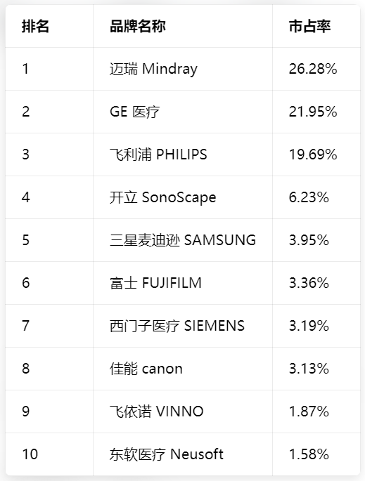 值得一提的是,近期众成数科也发布了2026年第一季度中国超声影像诊断设备市场统计分析报告。报告显示,2026年 Q1,国内超声影像诊断设备市场累计产生2559条招采信息,采购数量3991套,采购总金额34.97亿元,覆盖1324家采购单位、1583家中标单位,市场规模持续稳步增长。其中,在最具影响力品牌榜中,迈瑞以26.28%的市占率成功登顶,超越 GE医疗(21.95%)、飞利浦(19.69%)两大国际巨头,成为国内超声市场第一品牌,三大品牌合计占据超67%的市场份额,形成第一梯队。而在最具影响力自主品牌榜单中,迈瑞(62.23%)、开立(14.77%)、飞依诺(4.42%)、东软医疗(3.74)四大品牌共计占据了85.16%的市场份额,其中迈瑞以绝对优势领跑。这一格局也与湖南集采结果形成完美呼应,在中标三大品牌中,迈瑞、开立均为国产头部厂商,蓝影作为国产新锐,也凭借性价比优势在基层市场突围。从具体产品来看,在最具影响力产品榜中,飞利浦EPIQ CVx系列以6.73%的份额拿下单品榜冠军,迈瑞Resona A系列、GE LOGIQ E11/E20系列分列二、三名。从产品榜单可以看到,外资品牌仍在高端超声市场占据优势,飞利浦、GE 的高端系列产品占据榜单前列,合计市占率超 26%。国产品牌来看,迈瑞Resona系列、Nuewa系列两款产品合计市占率近 9%,开立S80系列以2.44%的市占率位列第九,国产产品主要集中在中端市场,与基层医疗机构的需求高度匹配。