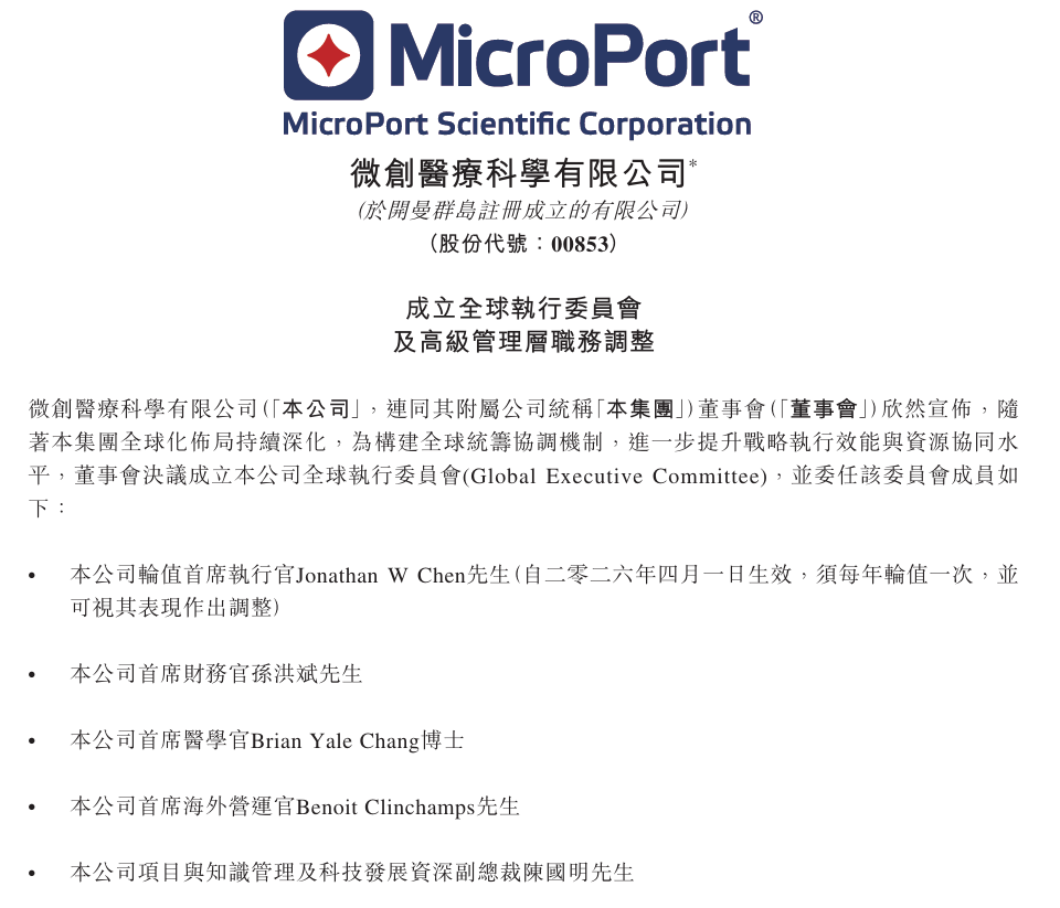 根据微创医疗公告,公司全球执行委员会(Global Executive Committee)委任该委员会成员如下: