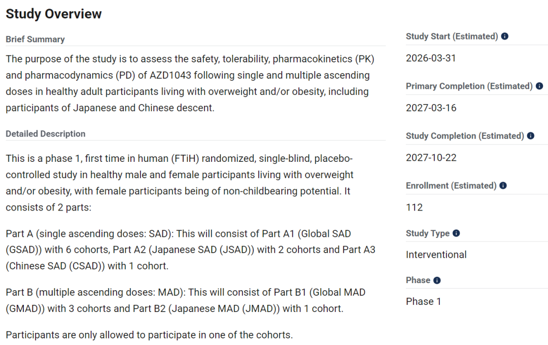 2026年4月6日,阿斯利康在Clinicaltrials.gov网站上注册了AZD1043用于减重的一期临床试验。