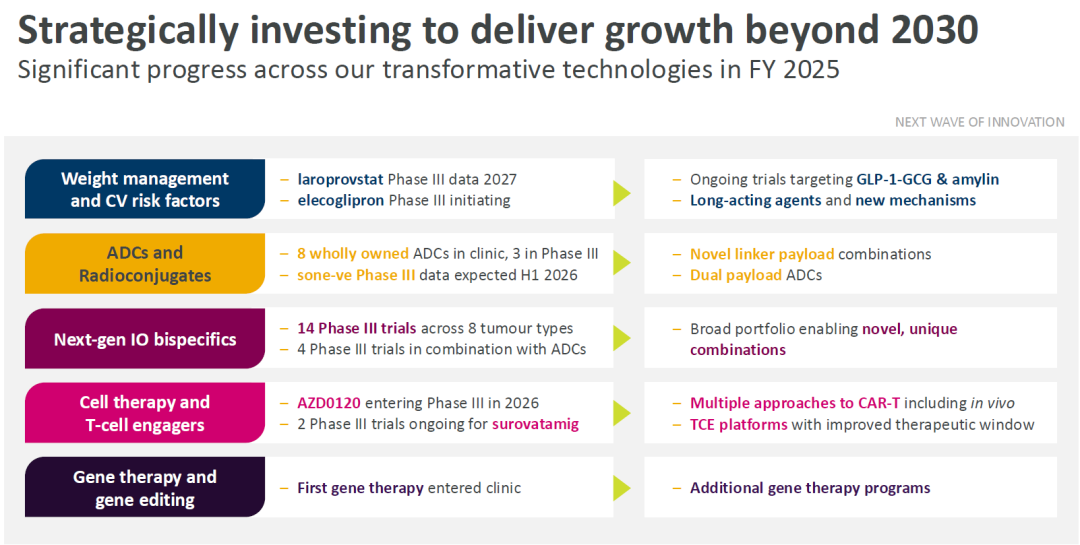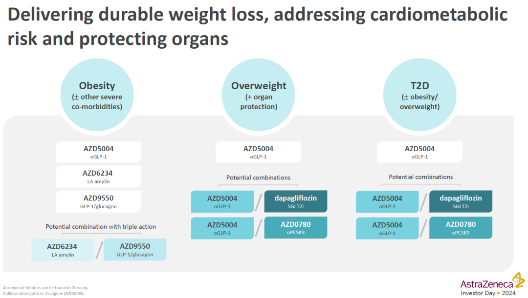 2026年财报中,阿斯利康再次强调了减重药物布局策略,除了小分子GLP-1、GLP-1/GCG+Amylin快速推进临床开发之外,长效化迭代产品和新机制药物也在快速扩展布局。
