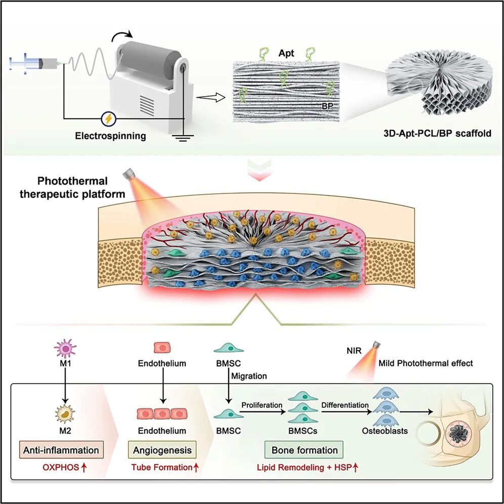 在这项新研究中,研究团队开发了一种近红外光(NIR)响应的治疗平台,该平台将临床可用的近红外光照射与工程化的三维放射状排列纳米纤维支架相结合,该支架通过单轴取向的聚己内酯(PCL)/黑磷纳米纤维膜的气体发泡来制造,从而形成径向取向的 3D 结构,并在纤维表面修饰了靶向骨髓间充质干细胞(BMSC)的核酸适配体(Apt19S)。