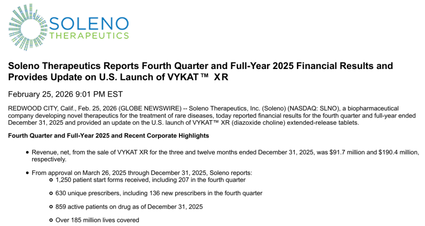 2025年3月,VYKAT XR获得美国FDA批准,成为全球首个且唯一用于治疗PWS患者食欲过盛的药物。Soleno2025财报显示,这款药同年第二季度上市后,短短半年多时间,就为Soleno带来了1.9亿美元的销售额,其中仅第四季度就狂揽近9200万美元。截至2025年12月31日,共有859名活跃患者服药。