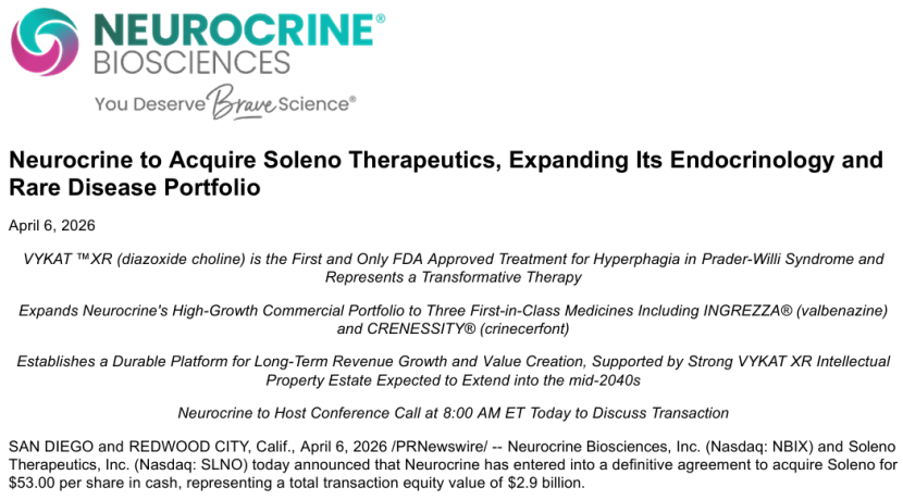 当地时间4月6日,神经科学领域的巨头 Neurocrine Biosciences 宣布,将以每53美元现金的价格收购 Soleno Therapeutics,总交易股权价值高达29亿美元。这一报价较 Soleno 4月2日的收盘价溢价约34%,较其30天成交量加权均价溢价51%。