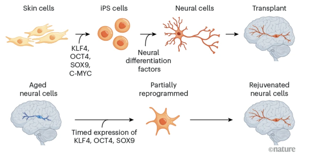 一切要从 20 年前说起,当时,京都大学的干细胞生物学家山中伸弥(Shinya Yamanaka)发现,只需过表达 4 种转录因子——Oct4、Sox2、Klf4 和 c-Myc(合称为 OSKM,也叫做山中因子),就能将已分化的成熟体细胞重置为胚胎干细胞状态,即诱导多能干细胞(iPSC),而 iPSC 能够再分化为任何类型的细胞,这未再生医学和抗衰老研究打开了新的大门。山中伸弥也因此获得了 2012 年诺贝尔生理学或医学奖。