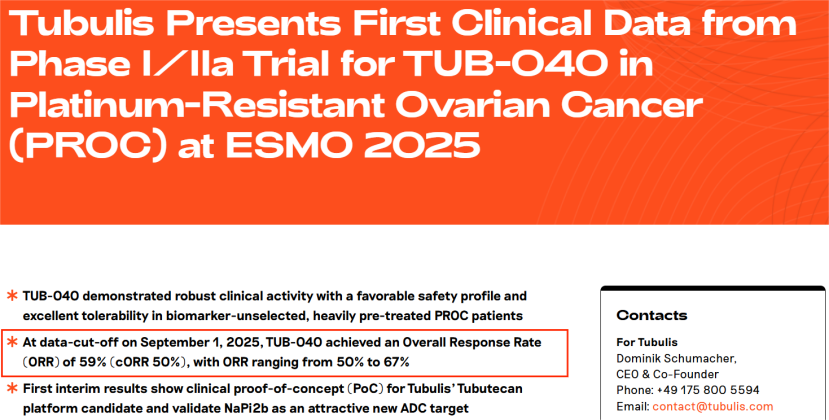但研发人员并没有彻底放弃NaPi2b。随着ADC技术的不断迭代,这个靶点又重新进入了大家的视野。全球已经有好几款相关药物推进到了临床试验阶段,比如Tubulis公司的TUB-040,以及国内苏州宜联生物的YL205。尤其值得一提的是,TUB-040在去年ESMO 2025公布的治疗铂类耐药卵巢癌的期临床数据里,客观缓解率(ORR)达到了59%,表现相当亮眼。除了ADC,也有企业尝试双抗路线,比如礼新医药的LM-2417。可以说,NaPi2b这个曾经让人望而却步的靶点,正在慢慢打开局面。