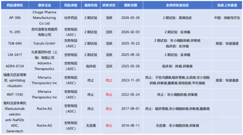 Pharma ONE药物研发大数据平台显示,罗氏开发的NaPi2b靶向ADC——Lifastuzumab vedotin在治疗铂类耐药卵巢癌的2期临床试验中未能达到无进展生存期(PFS)的主要终点,最后终止开发。同样,Mersana公司的Upifitamab Rilsodotin也因为2期临床中出现严重安全性问题,且未能达到主要终点而宣告失败。