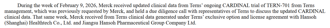 2026年2月9日,默沙东收到了Terns管理层提供的TERN-701正在进行的CARDINAL试验最新临床数据,并随即与Terns代表召开尽职调查电话会议,讨论更新数据。同周,默沙东还从Terns收到了根据Terns与翰森制药及豪森药业签订的独家选择权和许可协议所产生的临床数据。