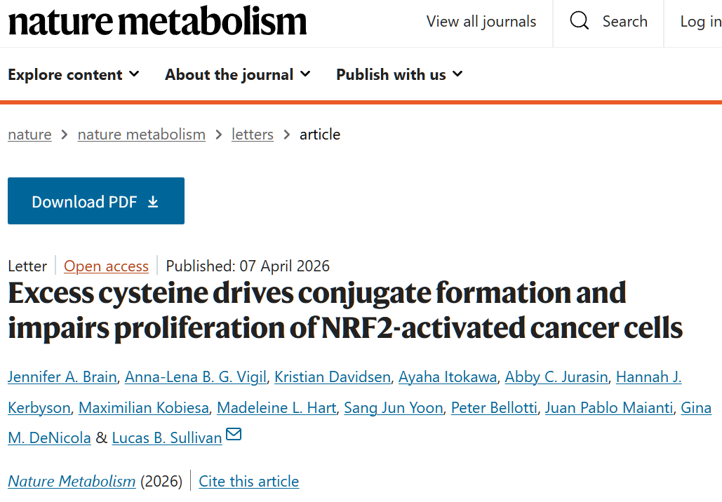 [1]Brain, J.A., Vigil, AL.B.G., Davidsen, K. et al. Excess cysteine drives conjugate formation and impairs proliferation of NRF2-activated cancer cells. Nat Metab (2026).
