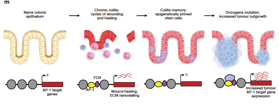 图2. 慢性炎症可在肠道干细胞中形成表观遗传“记忆”。反复炎症损伤与修复过程中,AP-1等转录因子持续激活相关基因调控区域,使干细胞处于“预激活”状态;当发生致癌突变时,这些细胞更容易表现出增强的增殖能力和肿瘤生长潜能。