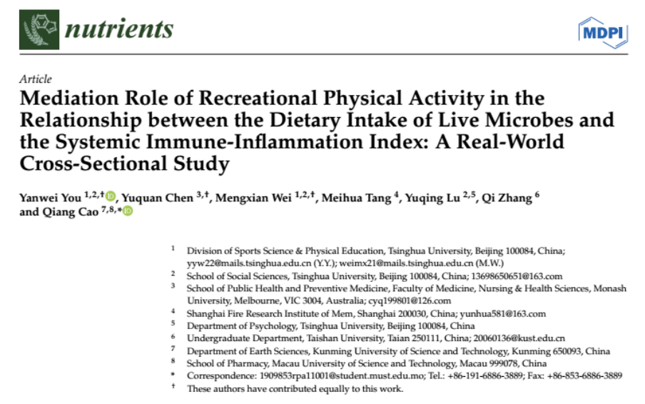 【3】You Y, Chen Y, Wei M et al. Mediation Role of Recreational Physical Activity in the Relationship between the Dietary Intake of Live Microbes and the Systemic Immune-Inflammation Index: A Real-World Cross-Sectional Study. Nutrients 2024, 16, 777.