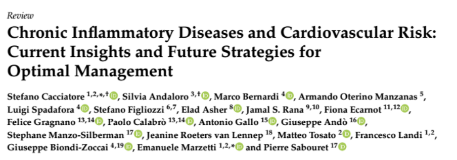 【1】Cacciatore S, Andaloro S, Bernardi M et al. Chronic Inflammatory Diseases and Cardiovascular Risk: Current Insights and Future Strategies for Optimal Management. Int J Mol Sci. 2025 Mar 27;26(7):3071. doi: 10.3390/ijms26073071. PMID: 40243756; PMCID: PMC11989023.