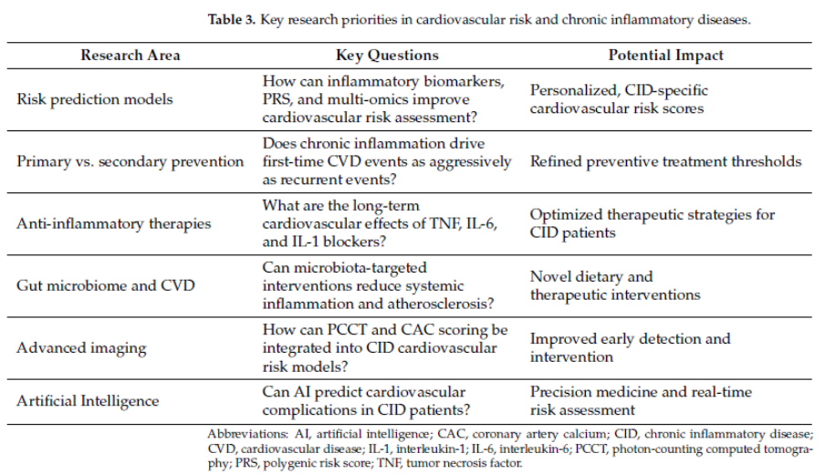 图1. 慢性炎症性疾病(CID)相关心血管风险的未来研究重点,包括风险预测模型优化、抗炎治疗长期效果评估、肠道菌群干预策略、先进影像技术整合以及人工智能辅助精准医学,旨在提升早期诊断能力并优化个体化干预策略。