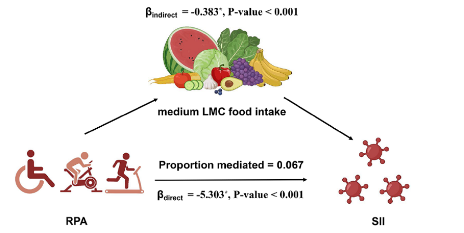 图3. 中等含量活性微生物食物(LMC)摄入与系统免疫炎症指数(SII)呈负相关,休闲体育活动(RPA)在其中发挥部分中介作用,提示健康饮食可能通过促进运动行为协同降低机体炎症水平。