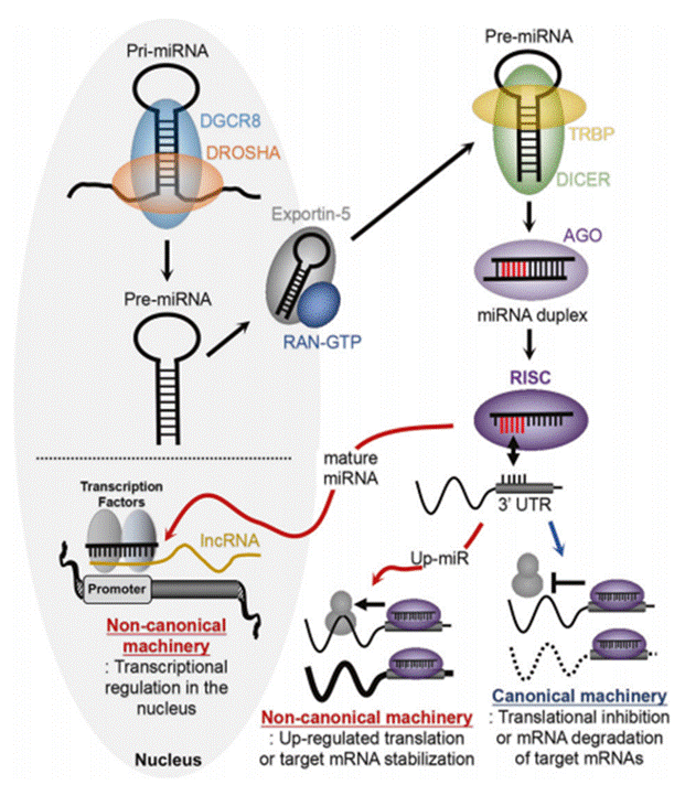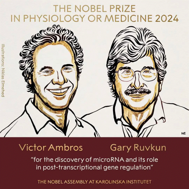 miRNA(微小核糖核酸)是真核生物中广泛存在的、长度约 22 个核苷酸的非编码RNA,最早于1993年由两位美国科学家Victor Ambros和Gary Ruvkun在秀丽隐杆线虫中发现,其通过与靶基因mRNA的 3'UTR区域互补配对,抑制翻译或促使mRNA降解,调控基因表达,参与细胞增殖、分化、凋亡等众多生理病理过程。2001年,Thomas Tuschl、David Bartel和Victor Ambros三人分别领导的三个研究组在Science杂志同期发文,将这种小RNA命名为microRNA(微小核糖核酸)。自此,miRNA被视为一类具有重要功能的分子。2003年,研究发现miRNA的生成路径,即由基因组编码的初级miRNA(pri-miRNA)经核内Drosha酶切割生成前体miRNA(pre-miRNA),再通过Exportin-5转运至细胞质,由Dicer酶切割生成成熟miRNA双链,最终加载到RISC复合物中发挥调控作用。miRNA的生物发生及功能机制(图源:Science)随后,研究发现miRNA参与细胞分化、发育、凋亡、代谢等几乎所有生理过程,且在肿瘤、心血管疾病、神经退行性疾病等中,miRNA表达谱发生特征性改变,成为疾病诊断和治疗的潜在靶点。2024年,诺贝尔生理学或医学奖授予了Victor Ambros和Gary Ruvkun,以表彰他们发现了miRNA及其在转录后基因调控中的作用。图源:瑞典皇家科学院作为内源性的RNA分子,miRNA疗法的魅力在于广谱的调控作用,单个miRNA可以调控多种mRNA靶点,对应多种生物学功能,因此业界预期miRNA疗法可通过增强/恢复或降低/阻断其功能,来逆转疾病,关于miRNA的研究也呈现爆发式增长。但是,miRNA的临床转化之路充满了曲折。miRNA的艰难探索历程