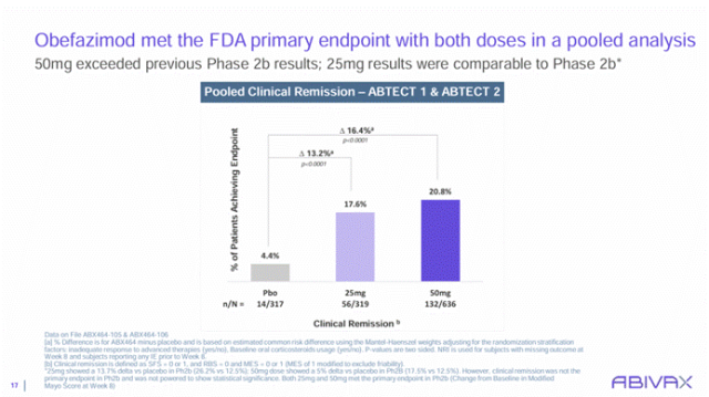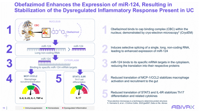 Abivax成立于2013年,由Truffle Capital投资基金的联合创始人创立,公司专注于开发利用人体自然调节机制治疗慢性炎症性疾。从成立之初,公司几乎就只有一个核心产品obefazimod,这是一款口服、FIC、增强miR-124表达的创新型疗法。miR-124是一种具有抗炎作用的microRNA,在多种炎症性疾病中常出现表达下调。Obefazimod通过结合CBC,促进长非编码RNA剪接,进而增强miR-124表达,下调IL-6、TNF-α等促炎细胞因子的水平,从而在源头上缓解肠道炎症。Obefazimod作用机制(图源:Abivax新闻稿)Obefazimod独特的作用机制,为IBD治疗提供了全新选择。IBD是一种慢性反复发作的肠道炎症性疾病,市场需求巨大,目前尽管已有生物制剂,以及S1P抑制剂,JAK1抑制剂等口服小分子产品上市,但仍有大约三分之一的IBD患者对生物制剂疗法没有反应,而且部分患者对现有小分子药物存在明显的应答减弱问题。Obefazimod凭借独特的作用机制,为其他机制药物治疗无效或不耐受的患者提供了新选择,而且得到了临床数据验证。2025年7月,Abivax宣布了Obefazimod针对中重度活动性UC患者的两项III期研究(ABTECT-1和ABTECT-2)进展,研究的主要终点为治疗第8周实现临床缓解的患者比例。ABTECT-1结果显示,Obefazimod 25mg、50mg剂量组分别有23.8%、21.7%的患者实现临床缓解,远高于安慰剂组的2.5%;分别有37.5%、33.3%的患者实现内镜评分改善,远高于安慰剂组的5.7%。ABTECT-2结果显示,Obefazimod 25mg、50mg的临床缓解率分别为11.3%、19.8%,远高于安慰剂组的6.3%,且对JAK抑制剂或生物制剂应答不足的难治性患者,仍能发挥显著疗效。安全性方面,Obefazimod展现出优异的安全性与耐受性,相较于现有JAK抑制剂(如乌帕替尼)具备更好的安全性优势。ABTECT-1&ABTECT-2研究结果(图源:Abivax新闻稿)值得一提的是,ABTECT项目是有史以来规模最大的UCIII期研究之一,并且纳入了数量最多的对JAK抑制剂反应不足的患者。在研究结果发布当日,Obefazimod股价暴涨超500%。Obefazimod凭借市场潜力巨大的适应症、FIC以及临床数据三重优势,使Abivax成为巨头眼中的香饽饽。同时巨头的关注,使得miRNA技术来到台前。诺奖加持下的miRNA技术