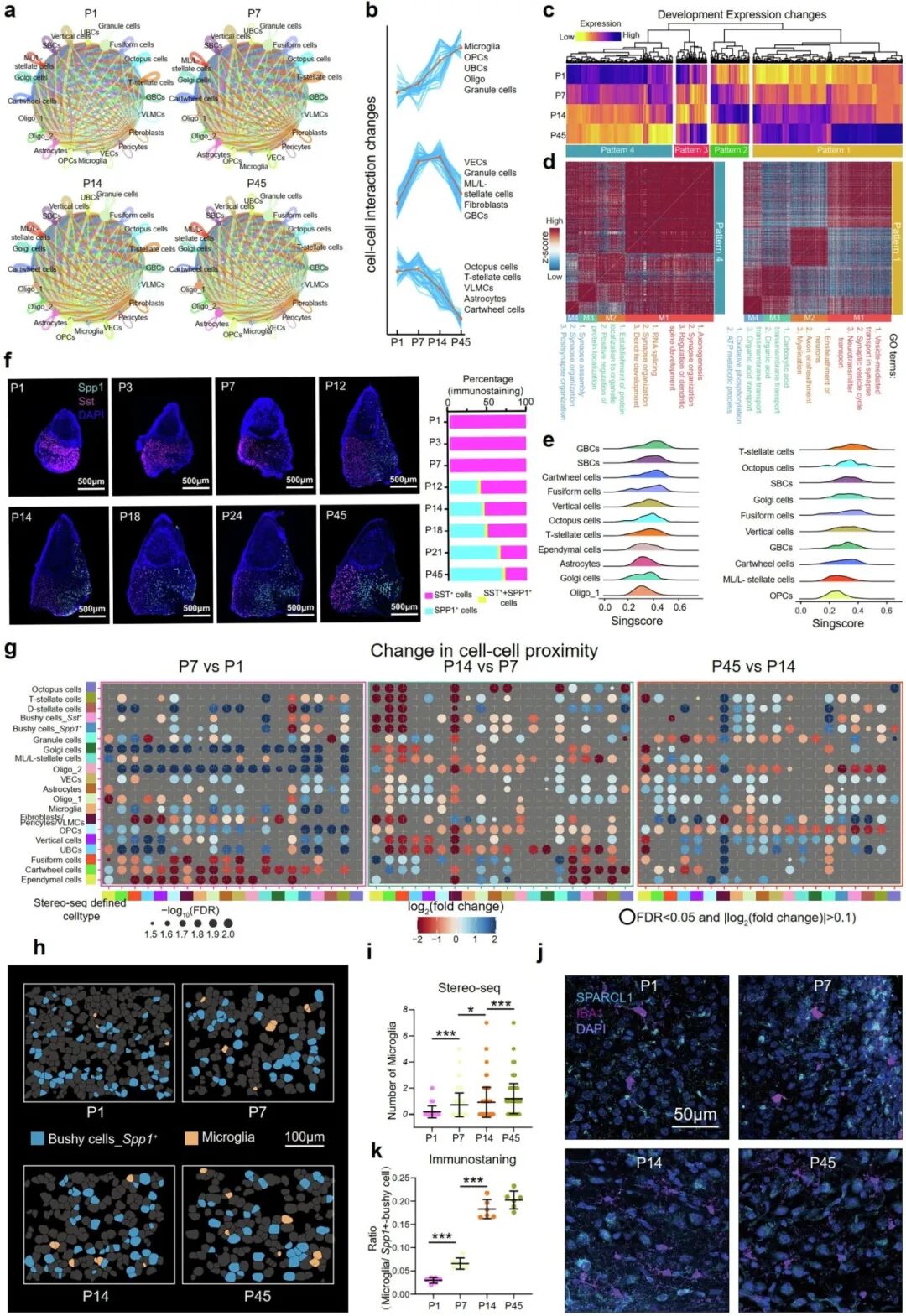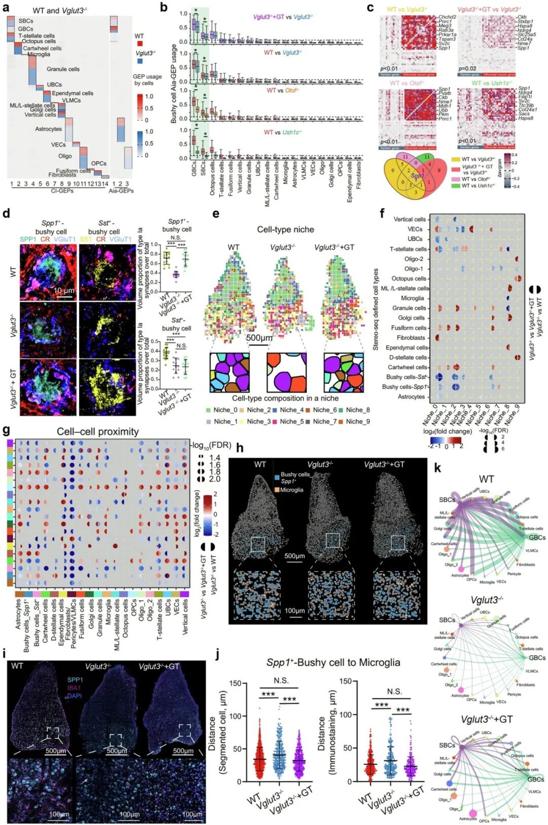 通过比较不同发育阶段和听力状态的小鼠,研究发现听觉输入能显著影响耳蜗核细胞的基因表达程序。在众多细胞类型中,灌木状细胞对听觉剥夺最为敏感,其转录组变化最为显著。空间分析进一步显示,在耳聋小鼠中,Spp1+灌木状细胞与其他细胞的空间邻近关系发生了改变,细胞间通讯强度也减弱了。