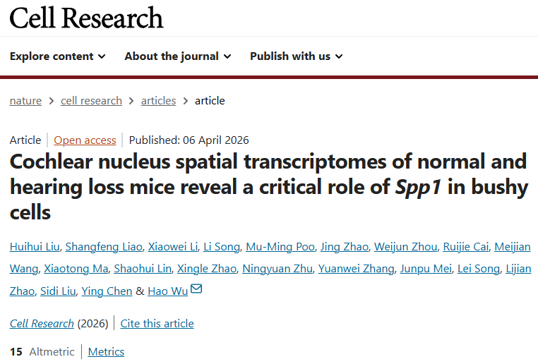 近日,上海交通大学医学院附属第九人民医院吴皓团队在国际知名期刊《Cell Research》发表一项重磅研究:利用单细胞空间转录组学技术,首次绘制了小鼠耳蜗核(Cochlear Nucleus, CN)的高分辨率分子与细胞图谱。不仅系统解析了耳蜗核的细胞类型组成和空间分布,更关键地揭示了骨桥蛋白编码基因Spp1在一种特定的灌木状细胞亚型中发挥的关键作用。该基因的表达受听觉活动直接调节,其缺失会严重影响耳蜗核的听觉信号处理功能。这一发现为深入理解听觉信息处理的生理与病理机制,以及未来开发针对耳蜗核水平的听力恢复疗法提供了至关重要的分子蓝图和新靶点。